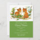Sweet twins baby shower invitation done in a green background, on the bottom of the invitation, with white custom text. Cute vintage artwork of two baby foxes in a winter setting, decorates the top of the invitation. Personalise the text for your baby shower.