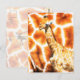 A painting of a baby giraffe up-against it's parent's belly. It has a lot of growing to do to catch up to the size of it's mum and dad.