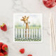 A playful giraffe peeking over a white picket fence with a daisy in its mouth.