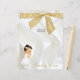 Beautiful baby girl with brown eyes in her christening dress and gold cross necklace. Background is white satin with a gold bow embellishment.
