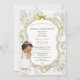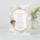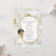 Beautiful baby girl in white dress, veil and gold cross necklace. Invitation background is white satin, gold filigree, a gold and silver glitter frame and bow embellishment. Back is adorned with gold flower pattern & gold ribbon on a white satin background.