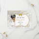 Beautiful baby girl in her christening dress, veil and gold cross necklace. Background is white satin, gold filigree, a gold and silver glitter frame and bow embellishment. Back is adorned with gold flower pattern on a white satin background.