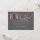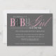 Baby shower invitation featuring the words "baby girl" in pink, grey and black with party details below.