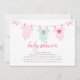 This adorable baby shower invitation features baby girls pink clothes hanging on a clothesline. The words "baby shower" are written in a pretty pink script.