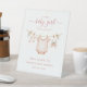 Greet your guests with charm using this baby girl clothesline welcome pedestal sign. The design features soft watercolor baby items—blush pink romper, tiny socks, and a plush bunny—hanging from a jute rope with eucalyptus accents. Set on a clean white background with delicate pastel tones, it brings a warm, modern touch to any baby girl shower.