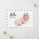 Simple and modern birth announcement card featuring a photo template with an overlay text in dark grey fonts that reads Hello, I'm Amelia (customisable with your baby's name). The white band on the lower part is personalizable with the birth stats in dark grey lettering.