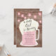 Fun a baby girl is brewing couples baby shower featuring a beer mug filled with pink beer set on a rustic wood background with hanging mason jar lights