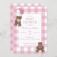 If you can "bearly" wait for the arrival of baby, customize this shades of pink and white buffalo check (plaid), teddy bears, ribbon bows, and balloons baby shower invitation. The back of the card features the same gingham background.
