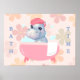 It's bath time and here's an adorable baby hippo sitting in a pink bath tub and wearing a pink turban, taking a bubble bath to keep you company!  There's a pretty wallpaper of flowers in the background.