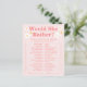Add fun to your baby in bloom baby shower with our 'Would She Rather' baby shower games, perfect for spring baby shower themes. These floral baby shower ideas fit seamlessly with a garden baby shower theme or wildflower baby shower theme, making it a delightful choice for a baby in bloom baby shower. Ideal for March baby shower ideas, these games also complement a daisy baby shower theme, offering playful entertainment for all your spring baby shower ideas and baby in bloom shower ideas.