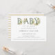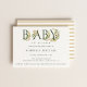 BABY In Bloom, watercolor flowers and delicate greenery adorned bold type letters, baby shower invitation. Back of card features coordinating neutral watercolor stripe pattern.