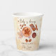 A Baby is brewing fall autumn baby shower customised monogrammed paper cups template, watercolor hot chocolate coffee cinnamon spices cookies maple leaves, brown background for autumn fall themed baby shower personalised tableware custom paper cups.