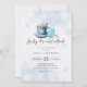 Cute blue boy baby shower winter invitation with snowflakes, hot cocoa, baby bottle and pacifier.
