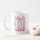 Festive holiday mug features the quote "baby it's cold outside" in red hand lettered typography accented with wintry snowflakes.