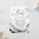 Modern baby shower invitation card featuring watercolor art of the winter mountain with pine trees with snowflakes in grey. The text says "Baby it's cold outside." Gender neutral design.
