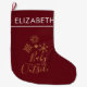 A festive Christmas stocking with an illustration of fancy golden snowflakes with elegant crystalline shapes. Trendy typography says: Baby it's cold Outside. Personalise with a name. Dark red background.