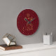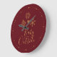 A clock with an illustration of fancy golden snowflakes with elegant crystalline shapes. Trendy typography says: Baby it's cold Outside. Dark red background.