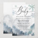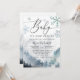 Modern baby shower invitation card featuring watercolor art of the winter mountain with pine trees with snowflakes. The text says "Baby it's cold outside."