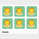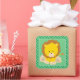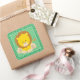 This sticker features a green border of a repeating pattern of jungle leaves. A cute baby clipart orange and brown lion sits in the centre of the sticker over a solid green background.