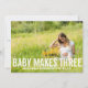 This design features a customisable text field, with the words "baby makes three" in a bold, white font