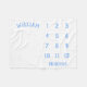 A simple and classic baby month milestone blanket shown with a white background and light sky blue text.