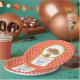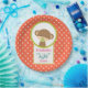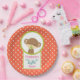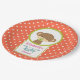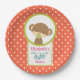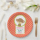 Baby shower paper plates. With a cute baby monkey holding a pacifier in his mouth Inside a circle with an olive green border. The background is an orange and white polka dot pattern. The letters in the word baby are hanging down from a boho style arrow. Personalise with your guest of honour's name.