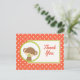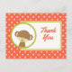 Baby shower thank you postcard. With a cute baby monkey with a pacifier in his mouth Inside an olive green circle. The background is an orange and white polka dot pattern. Custom message on the back which can be changed or left as is.