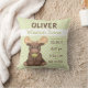 Birth stats pillow in green, brown, and white, featuring a baby moose with a pacifier. Simply personalise with your baby's name and birth stats - or customise to choose different fonts.
