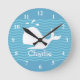 Blue baby name wall clock with cute whale in wavey sea. Cute gift idea for boys nursery room. Marine animal cartoon print.