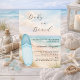 An elegant invitation for a Baby Shower, celebrating a baby boy. A watercolored sandy beach, ocean waves as background, and a blue surfboard on the beach.