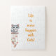I did order the puzzle in a 30 Oversized pieces format - however the puzzle pieces were small and as a result the puzzle could not be presented at the time of the proposal as it wouldve been rather time consuming! The printing turned out fine. The majority of colours were crisp and clear except for the gold border around the text - which turned out somewhat greenish