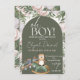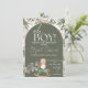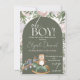 A cute baby shower design of a baby owl in a rocking horse and a choo choo train in green and peach and white colour background with personalisation options.