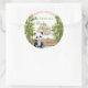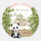 Adorable round sticker features a baby panda, front and centre with bamboo stalks on either side, balloons, and easy to update text.