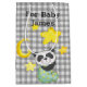Cute baby panda with a bright yellow moon and stars on a soft grey gingham pattern.