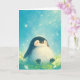 A fluffy baby penguin sits peacefully in a lush green meadow, bathed in the soft glow of warm sunlight. The penguin's eyes are closed, and a gentle smile graces its face, exuding pure joy and serenity. Delicate snowflakes float through the air, adding a touch of magic to the scene. The backdrop features a dreamy blue sky filled with soft bokeh light, creating an ethereal and heartwarming atmosphere. This charming illustration captures a whimsical blend of winter and spring, making it perfect for nature and animal lovers.