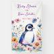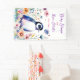 A cute baby penguin surrounded by pink, blue, orange and purple flowers watercolor illustration girl's baby shower banner.