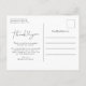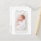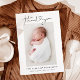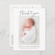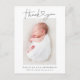 This stylish and elegant photo birth template announcement postcard features a photo of your newborn baby boy or girl, custom message that can be personalized, hand lettered typography text that says "Thank you" with a heart between the words. Add your newborn baby's name, birth stats, and the parents' names. The message on the back thanks the friends and family for the support and gift.