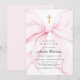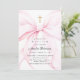 Coquette baptism invitation that features an elegant pink bow and a gold cross.