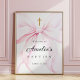 Coquette baptism welcome sign poster that features an elegant pink bow and a gold cross.