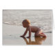 A cute picture of a baby crawling on the sand on the beach, enjoying the waves of water splashing.