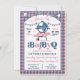 Blue or Pink, what do you think? Baby Q, Baby Shower BBQ backyard barbecue party. Features a retro grill, banners and fun typography on a Gingham pink blush and navy blue checked background. The back is white and and banner flags with light speckles. Great for an summer Baby Shower!