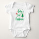 This charming baby bodysuit celebrates a significant milestone with its festive design. Front and centre is the phrase "Baby's first Christmas," playfully arranged in a mix of vibrant green and soft red typography, capturing the joy and excitement of the holiday season. The 'first' is emphasized with elegant cursive, while 'Baby's' and 'Christmas' are in a cheerful, bold font. Accentuating the text, a classic Christmas tree adorned with stars adds a traditional touch, and the scattering of stars and hearts around the words brings a whimsical and loving feel to the design. Perfect for holiday photos and family gatherings, this bodysuit is sure to be a keepsake item for anyone celebrating their baby's first foray into the festive season.