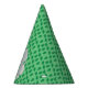 This party hat features a repeating pattern of green jungle leaves over a lighter green background and clipart of a cute grey baby elephant on the front.