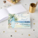 A watercolored sandy beach, ocean waves and palm trees as background, and a blue surfboard on the beach. Text: Baby on Board.