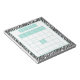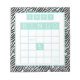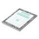 A chic aquamarine 40 page baby shower bingo notepad with an aqua mint border. Personalise these feminine animal print baby bingo paper game boards by adding the name of the mother to be and her due date. How to play: Instruct guest to fill in the blanks with baby gifts they think the new mummy will open and check them off when that item is unwrapped. Flat printed image. Original Art copyright of ©PartyPlans