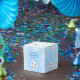 For an elegant, glamourous and girly style baby shower celebrating a baby boy. A light blue gradient background. Decorated with faux glitter spots and a cute elepahant baby boy. With the text: Baby Shower with a modern dark grey coloured hand lettered style script. Template for the mum to be's name.
