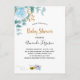 For a Baby Shower, celebrating a baby boy. A chic white background. Decorated with a light blue watercolored rose, flower, floral and grey green eucalyptus greenery, leaves, a golden sprig, and a cute happy smiling bee carrying an envelope. Personalise and add a name and party details. Black and golden letters. The text: Baby Shower and the name of the mum to bee are written with a modern hand lettered style script.