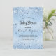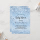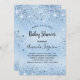 For a baby shower, celebrating a baby boy. A light blue faux metallic looking background. Decorated with faux glitter dust. Templates for the mum to-be's name and party details. The name and the text: Baby Shower are written with a hand lettered style script