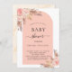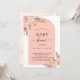 For a modern boho baby shower. An arch frame, white and rose gold colored background. Decorated with rose gold and pink florals, roses and pampas grass. Personalize and add a name and details.