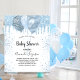 For a baby shower, celebrating a baby boy. A chic white background. Decorated with blue faux glitter drips, paint dripping look and blue and silver coloured balloons. Personalise and add the name of the mum to-be's name and party details. The name and the text: Baby Shower are written with a hand lettered style script